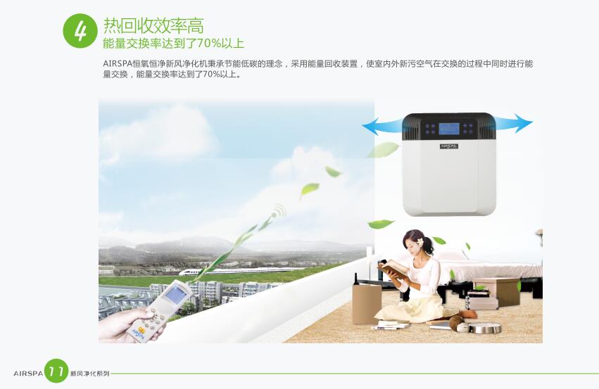 AIRSPA恒氧恒凈新風凈化機秉承節能低碳的理念,采用能量回收裝置,是室內外新污空氣在交換的過程中同時進行能量交換,能量交換率達到了70%以上。